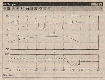 На рис. 3.2 показаны осциллограммы токов, напряжений и мощности в различных участках схемы. На рисунке хорошо видно, что при переход е преобразователя в инверторвый режим напряжение на нагрузке меняет знак, хотя направление тока остается прежним.