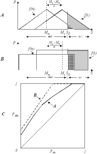 Рис.9. Различные варианты распределений f(s) и f(n) ( A и B ) и соответствующие им рабочие характеристики ( C ) 3.2.4. Показатель чувствительности d¢ В качестве основного показателя, характеризующего чувствительность сенсорной системы, принимается величина d¢: