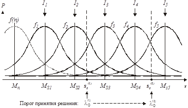 при этом для значения верхней границы дана некоторая условная величина, вытекающая из данных, которые могут быть получены в реальном эксперименте, а не теоретически возможная. Очень важным свойством показателя d¢ является то, что d¢ не зависит от значения порога принятия решения λ 0, который, в свою очередь, определяется несенсорными факторами (например, мотивацией испытуемого или значимостью для него различных вариантов ответа). Тем самым разделяются собственные свойства сенсорной системы (чувствительность - d¢), и характеристики процессов принятия решения (отражающиеся в значении λ 0). Именно это свойство d¢ обуславливает принципиальное отличие этого показателя от классических мер чувствительности - порогов чувствительности. В чём же это отличие? И в чём преимущество показателя чувствительности d¢ по сравнению с пороговыми мерами? С этой целью сопоставим показатель d¢ и величину порога, измеренную методом постоянных раздражителей (констант), а также проанализируем, к чему может привести неучет влияния внесенсорных факторов (порога принятия решения l0) при оценке абсолютной чувствительности. Предположим, что при проведении исследования использовано 5 значений стимула I: I 1; I 2; I 3; I 4; I 5. На сенсорной оси s каждому из этих значений будут соответствовать 5 распределений плотности вероятности сенсорных эффектов f1, f2, f3, f4, f5, с математическими ожиданиями Ms1; Ms2; Ms3; Ms4; Ms5, а также одно распределение f(n) с математическим ожиданием Mn. Графически это отражено на рис.10.