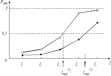 Рис.11. Изменение психометрической функции и значения порога, получаемые в методе констант при изменении порога принятия решения l 0. Следствием этого процесса является новая психометрическая функция и иное значение порога чувствительности - I (2)пор, существенно отличающееся от полученного ранее. Налицо явное противоречие – у одного и того же испытуемого в одних и тех же условиях проведения эксперимента получены разные значения порога и совершенно неясно, какое из них должно считаться «истинным». В некоторых же случаях возможно возникновение совершенно парадоксальной ситуации, когда рассчитываемая величина порога может принимать нулевые или даже отрицательные значения. Если ещё раз изменим λ 0 и проведем новую экспериментальную серию, то получим ещё одно значение Iпор, и т.д. Этой несуразицы можно избежать, если использовать в качестве показателя чувствительности d¢, который не меняется при изменении λ 0.