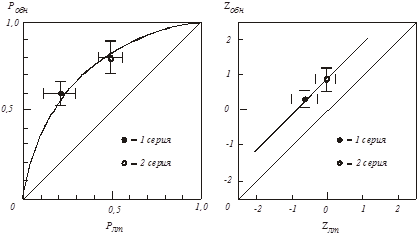 Для того, чтобы построить PX в Z-координатах, надо перевести значения Pобн и Pлт в Z-единицы. Сделать это можно, используя специальные таблицы Z-преобразования, где даны рассчитанные значения интеграла нормального распределения, и которые приводятся в любом руководстве по теории вероятности и математической статистике. Для нашего примера имеем: I серия: