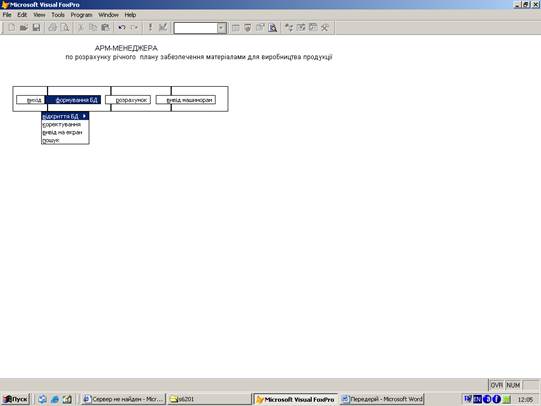 1. Завантаження СУБД Visual Fox PRO 9.0, а потім завантаження програми ARMMEN 2. Коригування баз даних з ціллю підготовки їх, в актуальному стані (предмет коригування в нашому випадку зміни записів) 3. Критичний аналіз роботи діалогового меню в вигляді АРМ-менеджера та власні пропозиції щодо вдосконалення структури меню діалогового режиму АРМ-менеджер. Вхідні дані: 1. Бази даних 2. ROZRAX, розробити структуру машинограми, а також VIVOD. 3. Результати рішення задачі в залежності від тих змін які будете вносити в машинограми. Запуск програми ARMMEN