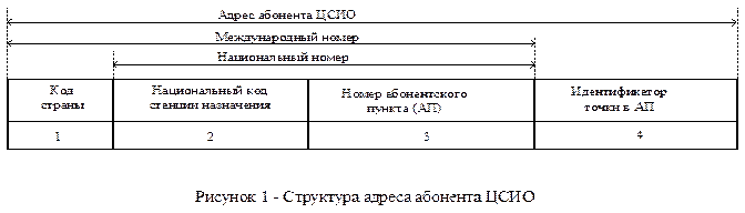 Структура ЦСИО определяется как расположением пользователей, так и разделением информационно-вычислительных и связных ресурсов. Структура ЦСИО разделяется на магистральную (базовую) и абонентскую (терминальную) (рисунок 2). Терминальная сеть включает в себя терминалы Т, абонентские пункты АП, концентраторы К и, в основном, цифровые каналы связи. Терминалы и АП, имеющие стандартный цифровой выход на 64 кбит/с могут непосредственно подключаться к УК. Магистральная (базовая) сеть включает УК, цифровые каналы, систему управления сетью и вычислительные ресурсы (ВК - вычислительные комплексы, БД - банки данных и т. п.). Топология магистральной сети может быть самой различной - звездообразной, кольцевой, распределенной и т. д. В последнее время по мере развития ЦСИО и увеличения ее размеров, структуру делают иерархической, что экономичнее и сокращает число переприемов. Основу технической базы ЦСИО составляют многоканальные системы передачи, обеспечивающие передачу всех типов сообщений в единой цифровой форме. Нумерация в ЦСИО. Система нумерации абонентов ЦСИО (рекомендация 1.334 ITU-T) подобна системе нумерации в существующей телефонной сети (рекомендация Е.164 ITU-T). Номер (адрес) абонентского пункта (АП) ЦСИО - это идентификатор, который состоит изадреса АП и адреса точки (порта) или устройства в АП. На рисунке 1 показана структура адреса абонента ЦСИО. В секции 2 адреса абонента может указываться код одной из специализированных сетей, составляющих часть ЦСИО, или одной из сетей ЦСИО, если их несколько в одной стране. Международный номер (секции 1, 2, 3) может состоять из 16-17 десятичных цифр, но обычно из 15. Секция 4 может содержать до 32 десятичных знаков. Это могут быть адреса компонентов АП, идентификатор точки S локальной вычислительной сети (ЛВС), номер станции ЛВС, номер порта этой станции, номер порта ЭВМ. Идентификатор точки в АП адресует объекты систем передачи и обработки данных. Адресация этих объектов регламентируется в рекомендациях серии X. ITU-T. Содержимое секций 1, 2, 3 адреса анализируется на коммутационных узлах ЦСИО, а адрес секции 4 передается без расшифровки (прозрачно) по каналам сети от одного АП до другого.