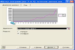 Рис.3.4. Диалоговое окно Мастера диаграмм: источник данных 5) заполните параметры диаграммы на разных закладках (рис. 3.5): названия диаграммы и осей, значения осей, линии сетки, параметры легенды, таблица и подписи данных. Щелкните по кнопке Далее.