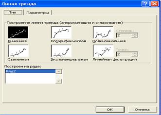 Рис.3.8. Диалоговое окно типов линий тренда В качестве дополнительной информации на диаграмме можно отобразить уравнение регрессии и значение среднеквадратического отклонения, установив соответствующие флажки на закладке Параметры. Щелкните по кнопке ОК. На рис. 3.9 -3.12 представлены различные виды трендов, описывающие исходные данные задачи