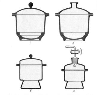 Рис.6. Ексикатори а – звичайний, б – звичайний з отвором для вакууму, в - високий тип ексикатора, г – високий з вакуумним краном (а та б – для твердих осушувачів, в та г – для твердих та рідких осушувачів)