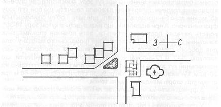 Протилежною симетрії є асиметрія. Асиметричне рішення вводиться для того, аби, з одного боку, виділити, підкреслити, позбавитись надмірної монотонності, а з другого -досягнути більшої єдності, рівноваги, якщо вони з якихось причин порушуються. Якщо симетрія створює рівновагу і візуально сприймається як статична і завершена структура, то асиметрія дає можливість надати цим статичним елементам динаміку, рух і певної загадковості. Наприклад, щоб акцентувати перевагу чи функціональну значимість однієї частини села над іншою, то при архітектурно-планувальній організації громадського центру в бік тієї частини вводять вказівні елементи асиметрії (рис. 1.5.).