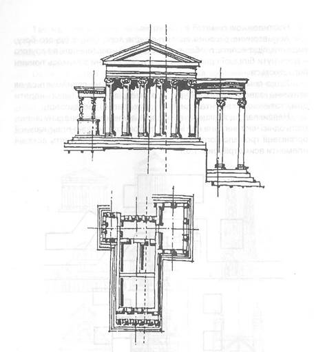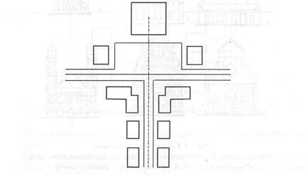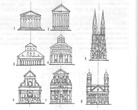 Так, на її двох протилежних відносно головної композиційної осі сторонах розміщаються приблизно різнозначні об'єми, які підпорядковані у всіх відношеннях основній домінанті, головній будівлі (переважно будинок просвіти). Отже, симетрія - однакове розміщення ідентичних за масою і геометричною характеристикою елементів відносно осі чи площини. Кожний елемент симетричного рішення має своє повторення чи свого двійника з іншого боку осі. Наглядним прикладом симетрії є дзеркальна симетрія, яка найбільше виражена при вирішенні фасадів храмів (рис. 1.4.).