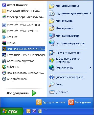 Рисунок 1. Меню «Пуск» программы Windows XP
