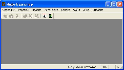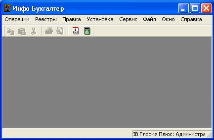 Рисунок 5. Главное окно программы Инфо-Бухгалтер 10 Следует отметить, что внешний вид главного окна программы Инфо-Бухгалтер 10, установленной на Вашем компьютере, может значительно отличаться от стандартного окна (см. Рисунок 1). Это обусловлено тем, что многие элементы главного и других окон программы легко настраивается самим пользователем или специалистом. В результате таких настроек – Вы будете видеть на экране только те элементы (пункты главного меню, кнопки и др.) которые необходимы для работы и часто Вами используются. И ничего лишнего. Главным окном программы обеспечивается вся работа пользователя. Вызов всех других окон происходит при помощи главного меню, а также кнопок панели инструментов (пиктографического меню). В дальнейшем, на конкретных ситуациях, с которыми встретится пользователь, будут рассмотрены возможности и назначение всех окон программы Инфо-Бухгалтер 10.