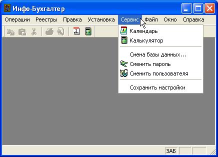 В пункте «Сервис» главного меню пользователи получают доступ к календарю и калькулятору программы Инфо-Бухгалтер 10, а также к ряду важнейших сервисных функций программы, позволяющих переключаться на другие базы данных, менять пароли и пользователей и сохранять настройки (Рисунок 11).