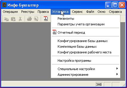 Приступая к настройкам, нам предстоит установить параметры учета в организации, а также реквизиты одной, или нескольких организаций, которых условно назовем «нашими организациями». Для этого следует выбрать пункт «Установка» в главном меню программы (Рисунок 43).