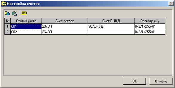 Статья учета – код статьи учета. Добавить новые статьи учета можно в справочнике статей учета. Счет затрат – счет затрат, соответствующий данной статье учета. В случае, если указан служебный счет с кодом АВТО, то программа при формировании проводок автоматически подставит счет затрат из настройки статей учета. Счет ЕНВД – счет затрат для суммы начисления в части ЕНВД (только для организаций – плательщиков ЕНВД). Регистр н/у – регистр налогового учета начисления, соответствующий данной статье учета. Кнопки панели инструментов:
