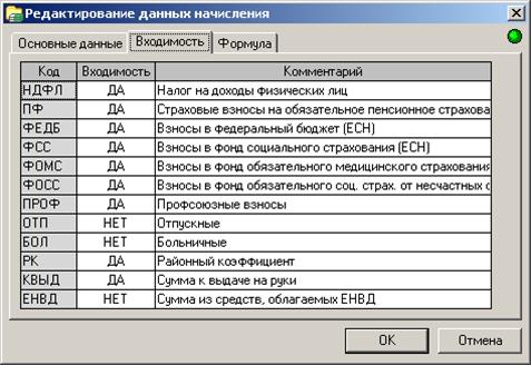 На этой закладке (Рисунок 109) представлена таблица настройки вхождения сумм начислений в базы различных расчетов (налоговые базы, базы для расчета среднего заработка и др.). Код – код суммового поля. Добавлять и редактировать суммовые поля можно в справочнике суммовых полей. Входимость – значение, определяющее вхождение суммы начисления в расчет данного суммового поля. Данный реквизит может принимать значения ДА/НЕТ. В случае, если для кода дохода начисления определены какие либо вычеты, то программа позволяет ввести в данное поле код вычета. Комментарий – описание вида расчета, соответствующее данному суммовому полю.
