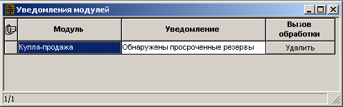 Прикладные модули программы могут автоматически (при старте программы) или по запросу пользователя, присылать и обрабатывать различные уведомления (Ошибка! Источник ссылки не найден.) Например, блок «Торговля» может оповещать о наличии просроченных резервов. Некоторые уведомления, по команде пользователя, могут быть обработаны пославшим их модулем. Например, в случае наличия просроченных резервов возможно тут же их удалить (Рисунок 143)
