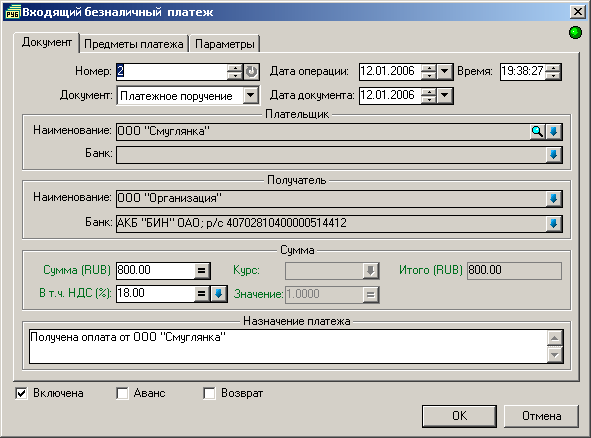 Рисунок 160. Окно «Входящий безналичный платеж».