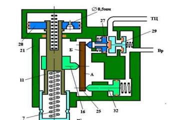 Авторежим кронштейном крепиться к хребтовой балке вагона. При загрузке вагона вследствие прогиба рессор упор авторежима упирается в опорную плиту, закрепленную на поперечной балке, соединенной с боковинами тележки вагона. Вследствие этого вилка 9 утапливается в корпусе демпферной части, а демпферный поршень вместе с ползуном и сухарем перемещается вверх и соотношение плеч «А» и «Б» рычага 25 рис. 18.2 Схема работы авторежима усл.№265-000.