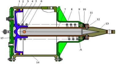 Он состоит из литого корпуса 14 (рис.21.1) передней крышки 8 с удлиненной горловиной и задней крышки 15, уплотненной резиновым кольцом. Заднюю крышку крепят к корпусу большим количеством болтов, чем переднюю, так как она испытывает усилие сжатого воздуха до 4 тс, в то время как передняя крышка нагружена только отпускной пружиной 5, имеющей предварительную затяжку 150 – 160 кгс. На поршне 4 установлены резиновая манжета 1 и войлочное смазочное кольцо 2, удерживаемое в проточке поршня распорной пластинчатой пружиной 3. С поршнем жестко связана посредством пальца 6 полая труба, являющаяся штоком 7. в горловине передней крышки расположены атмосферные каналы А, в которых установлены сетчатые фильтры 9. Резиновая шайба 10, надетая на трубу штока, защищает внутреннюю полость тормозного цилиндра от пыли. В торец штока вставлена головка 13, в проточку которой входят винты 11, крепящие упорное кольцо 12 к штоку. Это упорное кольцо предназначено для снятия передней крышки в сборе с поршнем и отпускной пружиной. На задней крышке имеются шпильки для крепления кронштейна мертвой точки и два резьбовых гнезда: одно для присоединения трубопровода для подвода сжатого воздуха, другое, заглушенное резьбовой пробкой – для установки манометра. Тормозной цилиндр усл.№ 519Б имеет такое же конструктивное исполнение, что и тормозной цилиндр усл. № 188 Б, но больший внутренний диаметр корпуса – 16 дюймов вместо 14 и устанавливается на шести- и восьмиосных вагонах.