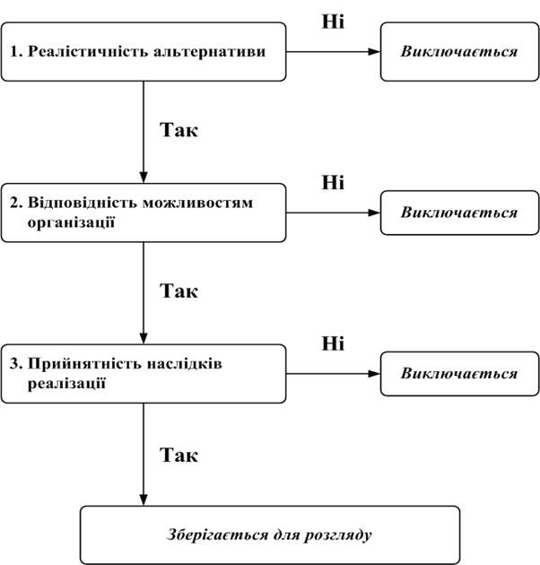 4. Оцінка альтернативних варіантів. Зміст цього етапу полягає у перевірці кожної знайденої альтернативи за критеріями (рис. 3.3): § реалістичність - можливість її здійснення взагалі з урахуванням зовнішніх обставин, не залежних від самої організації (юридичних обмежень, можливостей існуючих технологій, моральних та етичних норм тощо). § відповідність ресурсам організації; § прийнятність наслідків реалізації альтернативи: - не тільки основних, але і побічних; - не тільки безпосередній період реалізації альтернативи, але і майбутні періоди.