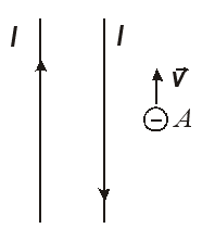 156. Задание {{ 41 }} ТЗ № 41 Предположим, что по длинному прямому проводу, лежащему недалеко от Вас в плоскости экрана, горизонтально течет ток в направлении СЛЕВА НАПРАВО. Между Вами и проводом также ГОРИЗОНТАЛЬНО СЛЕВА НАПРАВО движется электрон. Укажите верную комбинацию направлений вектора магнитной индукции в месте нахождения электрона и силы, действующей на этот электрон. * Вектор магнитной индукции вниз, сила от провода * Вектор магнитной индукции вниз, сила к проводу * Вектор магнитной индукции вверх, сила к проводу * Вектор магнитной индукции вверх, сила влево * Вектор магнитной индукции вверх, сила вправо 157. Задание {{ 42 }} ТЗ № 42 Предположим, что по длинному прямому проводу, лежащему недалеко от Вас в плоскости экрана, вертикально течет ток в направлении СНИЗУ ВВЕРХ. Между Вами и проводом также ВЕРТИКАЛЬНО но СВЕРХУ ВНИЗ движется электрон. Укажите верную комбинацию направлений вектора магнитной индукции в месте нахождения электрона и силы, действующей на этот электрон. * Вектор магнитной индукции вправо, сила к проводу * Вектор магнитной индукции влево, сила от провода * Вектор магнитной индукции влево, сила вверх * Вектор магнитной индукции вправо, сила вверх * Вектор магнитной индукции вверх, сила вправо 158. Задание {{ 43 }} ТЗ № 43 В магнитном поле двух бесконечно длинных параллельных проводников с одинаковыми токами пролетает электрон, как показано на рисунке. Сила, действующая на электрон в точке А, направлена