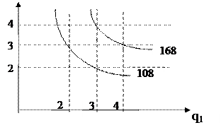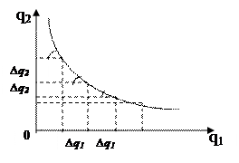 Рис. 3 Совокупность потребительских корзин, обеспечивающих потребителю одинаковый уровень удовлетворения, то есть имеющих одинаковую для него полезность, называется кривой безразличия. Свойства стандартных кривых безразличия следующие. Во-первых, кривая безразличия не может иметь участки возрастания. Во-вторых, кривые безразличия с разным уровнем полезности никогда не пересекаются. В-третьих, кривая безразличия может быть проведена через каждую точку в пространстве товара. И, наконец, кривая безразличия выпукла к началу координат и предельная норма замещения (наклон кривой безразличия) уменьшается при движении по кривой безразличия сверху вниз. Предельная норма замещения (MRS) - количество товара q2, от которого потребитель должен отказаться, чтобы получить еще одну единицу товара q1, оставаясь при этом на той же кривой безразличия. Она равна MRS = - ∆ q2 /∆ q1. Пусть функция полезности имеет вид: U=q1× q2. Будем рассматривать уровень полезности U= 60. Пусть q1 = 1; q2 = 60.