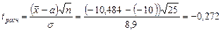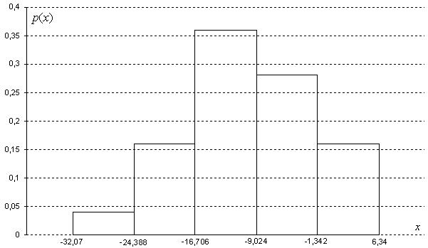 При измерении веса 25 упаковок сильнодействующего лекарственного препарата были обнаружены следующие отклонения (в гр.) от указанного на обертке: –24, 34; –14, 59; –18, 27; –8, 94; –15, 09; –10, 94; 4, 47; 3, 05; –8, 33; –22, 98; 1, 75; –32, 07; –7, 43; –18, 63; –12, 97; –11, 08; –7, 44; –1, 70; 6, 34; –11, 08; –11, 12; –15, 90; –10, 26; –8, 07; –6, 48. Необходимо: § Определить исследуемый признак и его тип (дискретный или непрерывный). § В зависимости от типа признака построить полигон или гистограмму относительных частот. § На основе визуального анализа полигона (гистограммы) сформулировать гипотезу о законе распределения признака. § Вычислить выборочные характеристики изучаемого признака: среднее, дисперсию, среднее квадратическое (стандартное) отклонение. § Используя критерий согласия «хи-квадрат» Пирсона, проверить соответствие выборочных данных выдвинутому в п.3 закону распределения при уровне значимости 0, 05. § Для генеральной средней и дисперсии построить доверительные интервалы, соответствующие доверительной вероятности 0, 95. § С надежностью 0, 95 проверить гипотезу о равенстве: а) генеральной средней значению –10; б) генеральной дисперсии значению 100. Решение: 1. Тип признака непрерывный, т.к. исходные цифры могут принимать любые дробные значения на определенном промежутке. Разобьем данные на 5 равных интервалов: Длина интервала