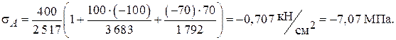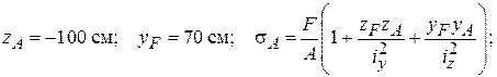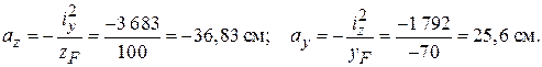 Відкладаємо в масштабі знайдені величини й будуємо епюру нормальних напружень (див. рис. 18). Під час побудови лінія зміни напружень перетинає вісь розрахункової схеми в точці, де проходить нульова лінія. Для побудови ядра перерізу (див. рис. 18) припустимо, що нульова лінія збігається зі стороною В–С (положення І–І). У такому разі відрізки, які вона відсікає на головних центральних осях інерції, дорівнюють: