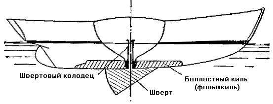 Швертботы (рис. 5) имеют мелкосидящий и относительно широкий корпус. В середине корпуса сделана щель, в которой помещается плоский (металлический или деревянный) выдвижной киль — шверт. Щель для прохода швер-та окружена деревянным или металлическим ящиком — швертовым колодцем, верхний срез которого расположен выше ватерлинии. Когда нет необходимости в дополнительном боковом сопротивлении (например, при попутных ветрах) или когда проходят мелкое место, шверт можно поднять и даже совсем убрать в швертовый колодец. Остойчивость швертбота много меньше, чем килевой яхты, и обеспечивается главным образом соответствующей формой корпуса—плоского и широкого, Швертбот может перевернуться при неумелом управлении, поэтому он менее безопасен при плавании в море и открытых водоемах, чем килевая яхта. Однако на современных гоночных швертботах с успехом проводят гонки в тяжелых морских условиях, при штормовых ветрах и большой волне. И все же крейсерские плавания в открытом море и на крупных озерах на крейсерских швертботах рискованны и, как правило, не разрешаются. Существуют еще промежуточные типы яхт, совмещающие характеристики описанных судов. Так, для получения повышенной остойчивости при небольшой осадке строят суда, имеющие шверт, проходящий внутри балластного киля (рис. 6). У этих судов осадка без шверта меньше, чем у килевых яхт, но больше, чем у швертботов. Такие яхты называют компромиссами.