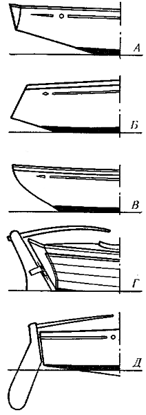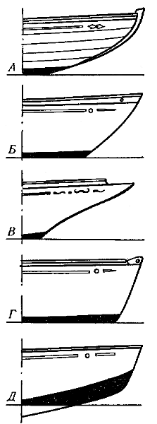 По форме носа яхты традиционно делятся на прямоштевники, яхты с ложко-образным штевнем и клипперштевнем (рис. 11). Однако сейчас ложкообразные штевни с большим носовым свесом вышли из моды, и большая часть современных яхт и швертботов имеют носы типа, изображенного на рис. 11, б. Прямой штевень в чистом виде сохранился сейчас только у некоторых швертботов. Давно исчезнувшие клипперштевни (рис. 11, в) в наши дни все чаще и чаще появляются не только на крупных моторных и парусно-моторных яхтах, но и на небольших крейсерах. У мелких швертботов и яхтенных шлюпок (тузиков) нос часто заканчивается не острым форштевнем, а плоским наклонным срезом (рис. 10, д). Такой нос называют транцевым (иногда— прам), а сам срез—носовым транцем или фсршпигелем. Транцевые носы имеют швертботы юношеских классов «Оптимист» и «Кадет». По форме кормовой части яхты могут иметь яхтенную корму с нормальными или обратным (реверсивным) транцем (рис. 10, а, б), байдарочную (рис. 10, в) или транцевую обрезную корму. Последняя имеет две разновидности; одна из них характерна для килевых яхт (рис. 10, г), другая—для швертботов (рис. 10, д).