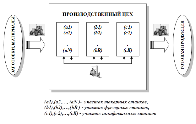 Применительно к структурным подразделениям современного производственного предприятия выделяют две формы специализации: по функциональному признаку (технологическая специализация) и по целевому признаку (предметная и подетальная специализация). Технологическая форма специализации характеризуется тем, что производственное подразделение специализируется на выполнении однородных технологических процессов и операций. Цехи и участки создаются по принципу общности основного технологического оборудования (рисунок 3.9). По такому принципу могут создаваться литейные, кузнечные, механические, термические и другие цехи, токарный и шлифовальный участок в механическом цехе.