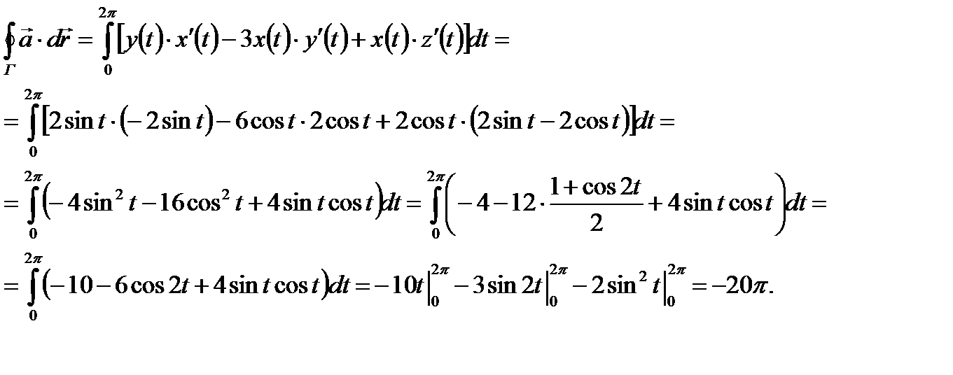 Если начать движение по кривой Г от точки A (2, 0, – 1) в которой значение параметра t равно 0, то при изменении параметра t до значения 2π, точка кривой вернется в исходную точку A. Используя теорему 2, можно записать:
