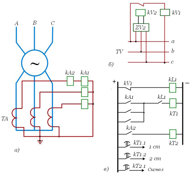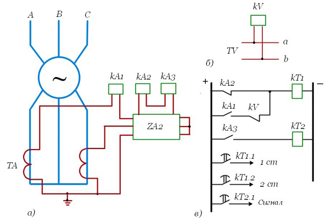 Защита выполняется на трех реле тока, включенных на фазные токи. Токовые реле подключаются к трансформаторам тока, установленным со стороны нулевых выводов обмотки статора. Для исключения срабатывания защиты при перегрузках пусковой орган дополнен блокировкой по напряжению из двух реле напряжения, реле напряжения обратной последовательности KV2и реле минимального напряжения KV1 (рис. 5.3)