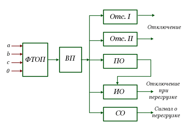 Четырехступенчатая токовая защита обратной последовательности включает в себя две отсечки, сигнальный, пусковой и интегральные органы (Рис. 5.5). Информация о токе с выхода фильтра токов обратной последовательности ФТОП через входные преобразователи ВП подается в схему. Чувствительная отсечка I предназначена для дальнего резервирования, грубая отсечка II – для ближнего резервирования, интегральный орган ИО – для защиты генератора от перегрузки токами обратной последовательности, сигнальный орган СО – для сигнализации о возникновении несимметричной перегрузки.
