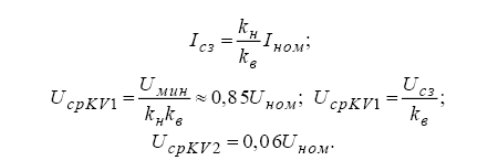 В состав защиты входят токовый пусковой орган - реле тока KA1 и KA2 и пусковой орган напряжения - фильтр-реле напряжения обратной последовательности KV2 и реле минимального напряжения KV1. При возникновении двухфазного короткого замыкания появляется напряжение обратной последовательности, которое приводит к срабатыванию фильтр-реле напряжения обратной последовательности KV2. Реле KV2 снимает питание с обмотки KV1, которое сработав в свою очередь запитывает обмотку реле KL1, тем самым разрешается прохождение команды на запуск реле времени от токовых реле. При трехфазных КЗ напряжение обратной последовательности отсутствует, и реле KV2 не работает. Однако в этих случаях снижения напряжения достаточно для срабатывания реле KV1. Ток срабатывания защиты отстраивается от номинального тока, реле минимального напряжения KV1 не должно работать в максимальных нагрузочных режимах U мин и в условиях самозапуска электродвигателей Uсз, напряжение срабатывания реле KV2 выбирается из условия отстройки от напряжения небаланса на выходе фильтра в нормальном режиме: