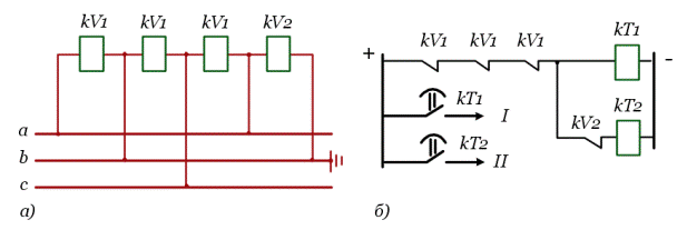 KV1 -реле минимального напряжения первой ступени; KV2 - реле минимального напряжения второй ступени; I - на отключение неответственных двигателей; II – на отключение ответственных двигателей