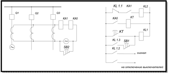 1. Для правильной работы защиты необходимо чтобы трансформаторы тока всех присоединений имели одинаковые коэффициенты трансформации. 2. Так как трансформаторы тока находятся в неодинаковых условиях, то имеет место большой ток небаланса. Для уменьшения тока небаланса принимают следующие меры: -применяют трансформаторы тока класса Д, имеющие не насыщающийся сердечник; -уменьшают сопротивление соединительных проводов, завышая их сечение. -дифференциальную схему собирают непосредственно на распределительном устройстве, а к реле протягивают лишь два провода; -применяют реле с торможением. Ложное отключение шин дифференциальной защитой приводить к серьёзной аварии. Под «ложным» имеется ввиду отключение, например, из-за обрыва соединительных проводов. В схеме защиты (рис. 8.5) предусмотрена блокировка, осуществляющая вывод её из действия в случае неисправности токовых цепей. Блокировка осуществляется с помощью токового реле нулевой последовательности КА0, включённого в нейтральный провод цепей защиты. В случае обрыва провода одной из фаз плеча любого присоединения несбалансированный ток фазы, пройдя через нулевой провод, вызовет срабатывание реле КА0, которое подаст «+» на обмотку реле времени КТ. Последнее, сработав, подаст «+» на обмотку промежуточного реле KL1. Это реле самоудерживается через свой нижний замыкающий контакт, а размыкающим (верхним) снимает «+» с контактов токового реле, выводя защиту из действия. Возврат блокировки в исходное положение осуществляется с помощью кнопки SB1.