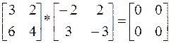 На закінчення, відзначимо одну цікаву особливість множення матриць. Виявляється, що добуток двох ненульових матриць може дати нульову матрицю. З факту, що A·B=0 ще зовсім не впливає, що A чи B=0. Наприклад: