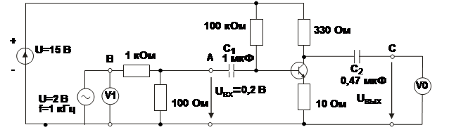 · Теперь определите выходное сопротивление RВЫХ. Для этого включите нагрузочный резистор RН = 10 кОм параллельно выходу усилителя (точки С - 0). Это также вызовет снижение выходного напряжения усилителя от U1 до U2. Выходное сопротивление можно вычислить, используя соотношение: