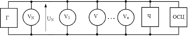 1. Для експериментальних досліджень впливу форми кривої та частоти вимірювальних сигналів на покази приладів різних систем необхідно скласти схему, зображену на рис. 2.1, де Г – генератор сигналів різної форми з регульованою частотою; VN – основний (зразковий) вольтметр, покази якого не залежать від форми кривої сигналу та його частоти (в межах заданого діапазону дослідження); V1, …, Vn – досліджувані вольтметри; Ч – частотомір; ОСЦ – осцилограф. За допомогою електронного осцилографа здійснюється візуальне спостереження за формою досліджуваного сигналу, а його амплітуду та часові параметри можна вимірювати з невисокою точністю – відносна стандартна непевність показів осцилографа становить 5...10%.