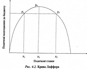 Прямі податки встановлюються безпосередньо на дохід і майно, а непрямі - виплачуються в ціні товару або включені до тарифу. Система оподаткування будується за такими принципами: обов'язковості; економічної доцільності; соціальної справедливості; поєднання інтересів держави, регіонів, підприємств і громадян. Реалізація цих принципів забезпечує надходження коштів до бюджетів відповідних рівнів і державних цільових фондів. Це так звана оптимальна точка, в якій поєднуються інтереси держави і підприємницького сектора. Високі податкові ставки створюють для держави і підприємців ряд проблем (адже вони здатні підірвати зацікавленість підприємців у розвитку своєї справи). Одночасно може статися так, що держава при застосуванні більш високих ставок податків одержить менше податкових надходжень до бюджету. Американський економіст Лаффер довів графічно, що до певної межі підвищення податкової ставки збільшує суму доходів бюджету, а потім вони поступово знижуються до рівня, зазначеного на рис. 4.2.