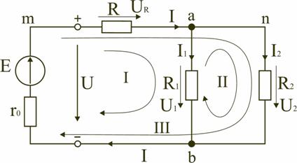 Рис. 1.2 Источник ЭДС на электрической схеме (рис. 1.2) может быть заменен источником напряжения U, причем условное положительное направление напряжения U источника задается противоположным направлению ЭДС. При расчете в схеме электрической цепи выделяют несколько основных элементов. Ветвь электрической цепи (схемы) – участок цепи с одним и тем же током. Ветвь может состоять из одного или нескольких последовательно соединенных элементов. Схема на рис. 1.2 имеет три ветви: ветвь bma, в которую включены элементы r0, E, R и в которой возникает ток I; ветвь ab с элементом R1 и током I1; ветвь anb с элементом R2 и током I2. Узел электрической цепи (схемы) – место соединения трех и более ветвей. В схеме на рис. 1.2 – два узла a и b. Ветви, присоединенные к одной паре узлов, называют параллельными. Сопротивления R1 и R2 (рис. 1.2) находятся в параллельных ветвях. Контур – любой замкнутый путь, проходящий по нескольким ветвям. В схеме на рис. 1.2 можно выделить три контура: I – bmab; II – anba; III – manbm, на схеме стрелкой показывают направление обхода контура. Условные положительные направления ЭДС источников питания, токов во всех ветвях, напряжений между узлами и на зажимах элементов цепи необходимо задать для правильной записи уравнений, описывающих процессы в электрической цепи или ее элементах. На схеме (рис. 1.2) стрелками укажем положительные направления ЭДС, напряжений и токов: а) для ЭДС источников – произвольно, но при этом следует учитывать, что полюс (зажим источника), к которому направлена стрелка, имеет более высокий потенциал по отношению к другому полюсу; б) для токов в ветвях, содержащих источники ЭДС – совпадающими с направлением ЭДС; во всех других ветвях произвольно; в) для напряжений – совпадающими с направлением тока в ветви или элемента цепи. Все электрические цепи делятся на линейные и нелинейные. Элемент электрической цепи, параметры которого (сопротивление и др.) не зависят от тока в нем, называют линейным, например электропечь. Нелинейный элемент, например лампа накаливания, имеет сопротивление, величина которого увеличивается при повышении напряжения, а следовательно и тока, подводимого к лампочке. Следовательно, в линейной электрической цепи все элементы – линейные, а нелинейной называют электрическую цепь, содержащую хотя бы один нелинейный элемент.