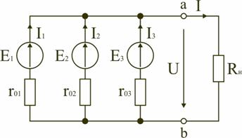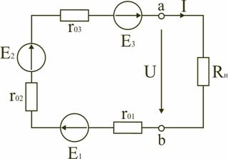 Рис. 1.20 Для этой цепи на основании второго закона Кирхгофа можно записать E 1+ E 2+ E 3= I (r 01+ r 02+ r 03+ R н), откуда