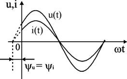 Зададимся изменением тока в резисторе по синусоидальному закону i(t) = ImR sin(ω t + ψ i). Воспользуемся законом Ома для мгновенных значений тока и напряжения u(t) = R i(t) и получим (2.13) u(t) = R ImR sin(ω t + ψ i). Формальная запись синусоидального напряжения имеет вид (2.14) u(t) = UmR sin(ω t + ψ u) Соотношения (2.13) и (2.14) будут равны если будут выполнены условия равенства амплитуд и фаз (2.15) UmR = R ImR, (2.16) ψ u = ψ i. Соотношение (2.15) может быть записано для действующих значений (2.17) UR = R IR. Соотношение (2.16) показывает, что фазы напряжения и тока в резисторе совпадают. Графически это представлено на временной диаграмме (рис. 2.7) и на комплексной плоскости (рис. 2.8).