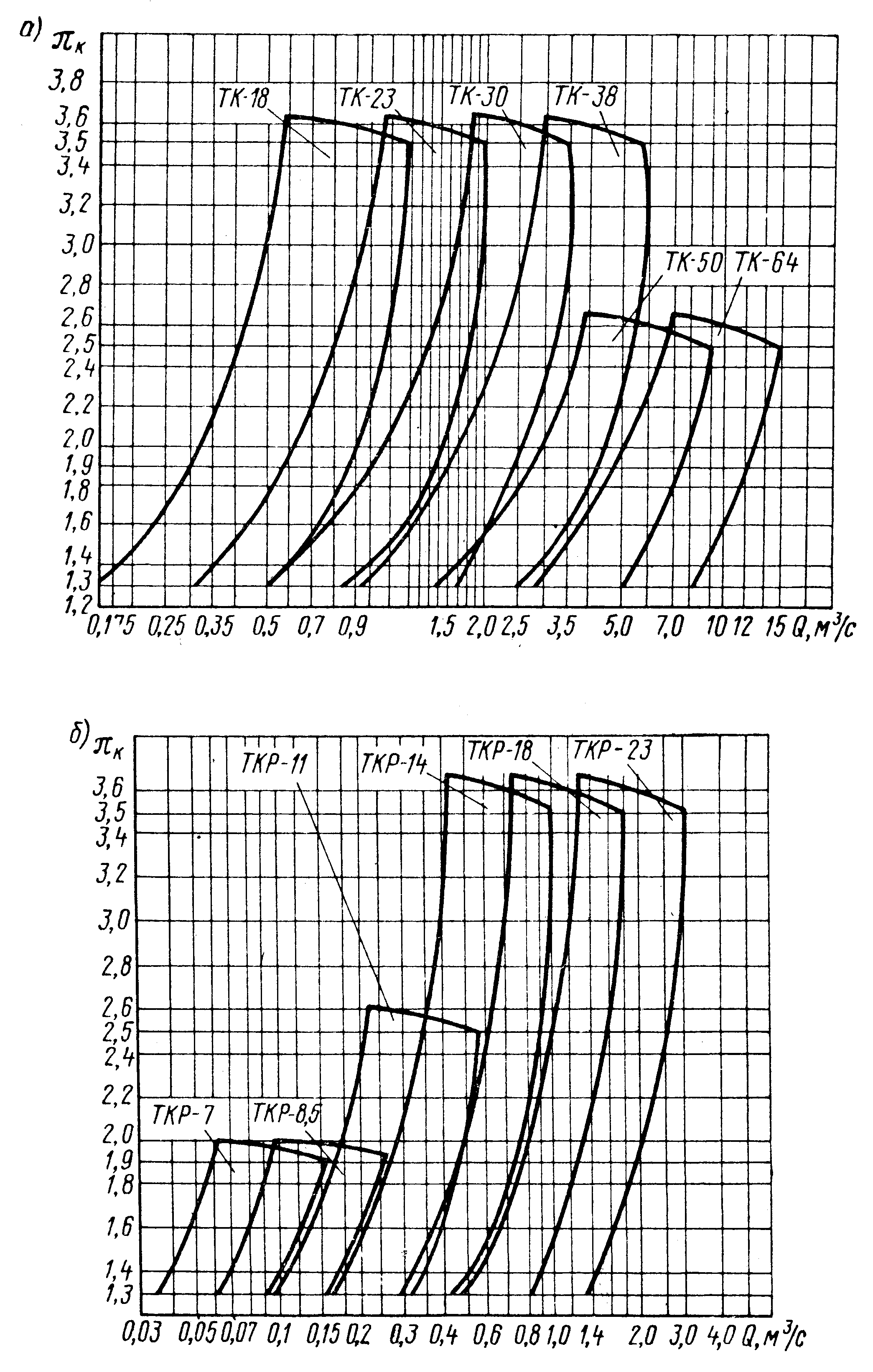 Рисунок 1 - Поля продуктивності турбокомпресорів типу ТК (а) і ТКР (б) Після розрахунку турбіни перевіряють відповідність отриманого ККД прийнятому і рівність потужностей компресора і турбіни. Дані параметри не винні відрізняться більше 10%. Виконується ескіз турбіни і проводиться її розрахунок. Методики розрахунку доцентрової (радіальною) і осьової турбіни однакові. Визначивши основні розміри і параметри турбокомпресора, проводиться профілізація меридіональних перетинів колеса компресора і колеса доцентрової турбіни. Виконується профілізація дифузора лопатки і соплового апарату турбіни, використовуючи існуючі профілі лопаток. Профілі соплових і робочих лопаток осьової турбіни отримують шляхом їх побудови. Виконується подовжній (по осі ротора) переріз турбокомпресора. Подовжні перерізи деяких турбокомпресорів приведені в додатку.