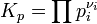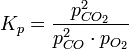 где ν i — стехиометрический коэффициент (для исходных веществ принимается отрицательным, для продуктов — положительным). Kp не зависит от общего давления, от исходных количеств веществ или от того, какие участники реакции были взяты в качестве исходных, но зависит от температуры. Например, для реакции окисления монооксида углерода: 2CO + O2 = 2CO2 константа равновесия может быть рассчитана по уравнению: