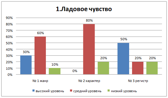 2.2. Методики проведения констатирующего эксперимента В рамках констатирующего эксперимента были использованы следующие методики: 1. Методика диагностики музыкальных способностей О.П. Радыновой (Приложение 2). 2. Модифицированный вариант диагностики уровня сформированности чувства ритма для старших дошкольников, с использованием музыки и движения, составленную на основе авторских работ А.И. Бурениной и А.Н. Зиминой (Приложение 3). 2.3. Анализ результатов констатирующего эксперимента В ходе проведения диагностики музыкальных способностей (О.П. Радыновой) были получены следующие данные (Приложения 5): Ладовое чувство (Диаграмма 1). Задание № 1: Прослушать и различить три пьесы разные по жанру: марш, полька, колыбельная. Выбрать карточку в соответствии с жанром. 30% - детей внимательно слушали музыкальные фрагменты, определяли жанр (марш, полька, колыбельная) и выполняли задания без подсказки; 60% - слушали невнимательно, отвлекались, определяли жанр музыкального произведения, выкладывали карточки. 10% - задание выполняли верно, нет заинтересованности. Задание № 2: Слушать не знакомую песню, определить ее характер и содержание (Т. Попатенко «Листопад»; М. Красев «Веселая дурочка»). 0% - внимательно слушает, может определить характер, рассказать, о чем песня. 80% - слушают невнимательно, не могут рассказать о содержании, но могут определить характер. 20% - нет заинтересованности, почти не реагируют на песню. Задание № 3: С помощью дидактической игры «Медведь, лиса и воробей», определить регистр, выложить соответствующую карточку. 50% - внимательно слушают музыкальные фрагменты, определяют регистр, правильно выполняют задание. 30% - слушают невнимательно, отвлекаются, но могут выполнить задание. 20% - нет заинтересованности, не выполняют задания или выполняют неверно.