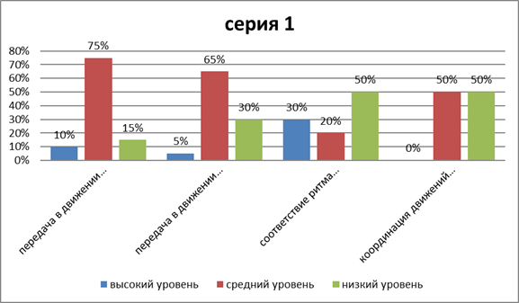 В результате проведения диагностики уровня музыкальных способностей были выявлены следующие уровни развития детей: 2 ребенка имеют низкий уровень развития, 8 – средний. Высокого уровня развития музыкальных способностей у данной группы нет (Приложение 4). Низкий уровень развития имеют часто болеющие дети, которые редко посещают детский сад. На основе теоретического анализа имеющихся вариантов диагностики пространственных представлений дошкольников, мы попытались разработать модифицированный вариант диагностики уровня сформированности чувства ритма для детей старшего дошкольного возраста, с использованием музыки и движения, составленную на основе авторских работ А.И. Бурениной, А.Н. Зиминой. В диагностическим материале представлено три серии заданий. К каждому заданию определены оценочные критерии от 1 до 3 баллов. (Приложение 3): В первой серии (Диаграмма 4) мы выявили сформированность движений в соответствии с ритмом. В ней представлены такие задания: 1.1. «Передача в движении характера знакомого музыкального произведения»; 1.2. «Передача в движении характера незнакомого музыкального произведения (фрагмента) после предварительного прослушивания»; 1.3. «Соответствие ритма движений ритму музыки»; 1.4. «Координация движений и внимание» («ритмическое эхо со звучащими жестами»).