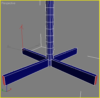 Штатив складається із стійки і хрестовини, яка додає конструкції стояти. Змоделюємо їх за допомогою стандартного примітиву Cylinder (Циліндр) і редагованих поверхонь. Створіть у вікні проекції стандартний примітив Cylinder (Циліндр) з наступними параметрами: Radius (Радіус) - 40, Height (Висота) - 850, Height Segments (Кількість сегментів по висоті) - 13, Cap Segments (Кількість сегментів в основі) - 1, Sides (Кількість сторін - 16 Щоб об'єкт прийняв згладжену форму, встановіть прапорець Smooth (Згладжування). Одержаний об'єкт необхідно вирівняти так, щоб він розташовувався в площині XY під виступом, створеним на корпусі мотора. Зробити це можна двома способами. Більш простій, але в той же час не зовсім точний - перейти у вікно проекції Bottom (Знизу) і за допомогою команди Move (Переміщення) підібрати положення об'єкту на око. Щоб більш точно розташувати штатив відносно виступу, створеного на корпусі мотора, необхідно використовувати команду вирівнювання. Зробити це можна буде тільки в тому випадку, якщо виступ буде самостійним об'єктом. Щоб перетворити його в незалежний об'єкт, виділіть корпус мотора. Перейдіть на вкладку Modify (Зміна) командної панелі. Розкрійте рядок Editable Poly: в стеку модифікаторів, клацнувши на значку плюса. Перемкніться в режим полігон.
