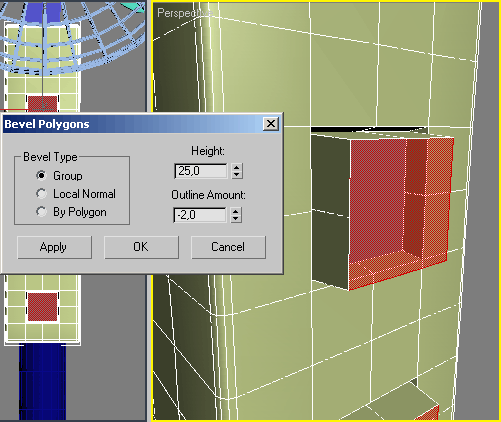 Щоб зменшити площу полігонів, з якими ми працюємо, скористаємося командою Outline (Контур). Клацніть на кнопці Settings (Настройки), розташованій праворуч від кнопки Outline (Контур) в Edit Polygons (Редагування полігонів) настройок об'єкту на командній панелі. У вікні Outline Polygons (Збільшення полігонів) встановите значення параметра Outline Amount (Величина контура) рівним -2. Скористаємося інструментом Bevel (Видавлювання з скосом) для створення кнопок. Клацніть на кнопці Settings (Настройки), розташованій праворуч від кнопки Bevel (Видавлювання з скосом) в свиті Edit Polygons (Редагування полігонів) настройок об'єкту на командній панелі. У вікні Bevel Polygons (Скіс полігонів) встановите значення параметра Height (Висота) рівним 25. В результаті коробки виглядатиме, як зображено на мал. 3.146. На цьому моделювання коробки з кнопками управління закінчено.