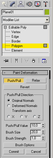 Полігональне моделювання — один з найпоширеніших способів створення моделей в тривимірній графіці. Не дивлячись на те що в 3ds max реалізована достатньо велика кількість засобів для створення об'єктів на основі Editable Poly (Редагована полігональна поверхня), ці інструменти не завжди зручні. Наприклад, іноді бажано, щоб об'єкт був немов пластиліновий, і із тривимірною моделлю можна було працювати так, як скульптор працює із глиною. В 3ds max 7 в настройках об'єкту із'явився Paint Deformation (Деформація пензлем), який дозволяє деформувати об'єкт саме таким чином. Він надає в розпорядження розробника тривимірної графіки набір пензлів, за допомогою яких можна вдавлювати і зміщувати положення вершин сітки об'єкту. Paint Deformation (Деформація пензлем) дуже зручно використовувати при роботі із поверхностями, що містять велику кількість полігонів. Розглянемо простий приклад використовування Paint Deformation (Деформація пензлем). Створіть у вікні проекції стандартний примітив Plane (Площина). Перейдіть на вкладку Modify (Зміна) командної панелі і в настройках об'єкту встановіть значення параметрів Length Segs (Кількість сегментів по довжині) і Width Segs (Кількість сегментів по ширині) рівним 40. Конвертуйте об'єкт в Editable Poly (Редагована полігональна поверхня). Для цього клацніть правою кнопкою миші на об'єкті і виконайте команду Convert To > Convert to Editable Poly (Перетворити > Перетворити в редаговану полігональну поверхню). Виділіть об'єкт Plane (Площина) у вікні проекції і перейдіть на вкладку командної панелі Modify (Зміна). Розкрійте список Editable Poly (Редагована полігональна поверхня) в стеку модифікаторів і перемкніться в режим редагування Polygon (Полігон). Розверніть Paint Deformation (Деформація пензлем) і натискуйте кнопку Push/ Pull (Вдавлюавати/витягувати) (мал. 3.152). Підведіть курсор миші до об'єкту Plane (Площина). Форма курсору зміниться — він прийме вид кола із нормаллю, вказуючою напрям дії (мал. 3.153). Натискуючи і утримуючи кнопку миші, змінюйте положення покажчика. При цьому виконуватиметься видавлювання (мал. 3.154). Напрямом дії пензля на об'єкт можна управляти за допомогою настройок в області Push/Pull Direction (Напрям вдавлювання/витягання).
